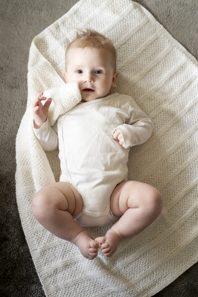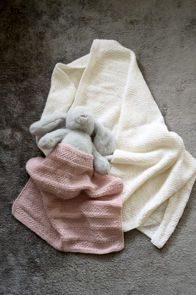 Kosedyret skal selvfølgelig ha et matchende teppe! Dette mindre teppet er – som det store teppet – strikket fram og tilbake, i enkelt strukturmønster, også med riller langs kantene.