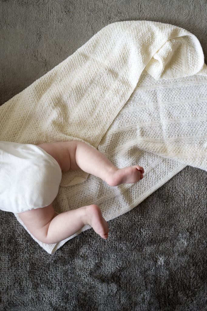 Kosedyret skal selvfølgelig ha et matchende teppe! Dette mindre teppet er – som det store teppet – strikket fram og tilbake, i enkelt strukturmønster, også med riller langs kantene.