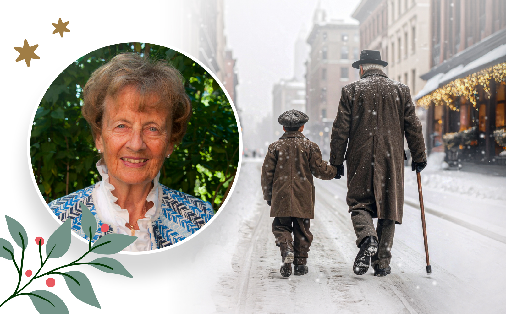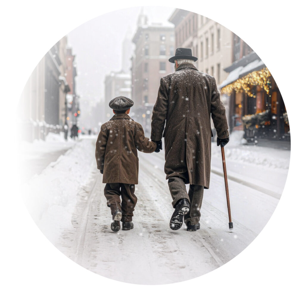 Han tok den gamle mannen i hånden, og sammen ruslet de bortover fortauet. Han visste at han ikke fikk lov til å bli med fremmede, men dette var tross alt julenissen.